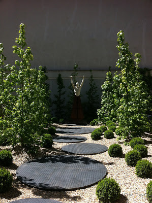 Hacemos la primera parada en el “Bosque Urbano” del paisajista Jesús Ibáñez. Su composición basada en la geometría de la arboleda con suelo de gravilla y círculos metálicos como antesala a la magnífica escultura de Jesús Curiá nos pareció una belleza.